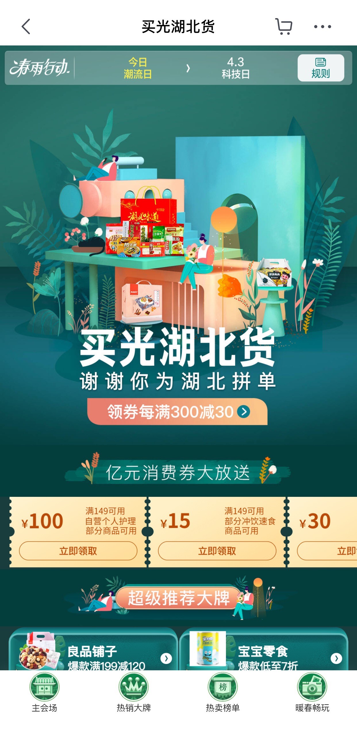 京东也积极响应号召,与近百家媒体共同发出#买光湖北货#的倡议。4月1日,京东开启“春雨行动”大促,并在大促中上线“买光湖北货”专区页面。当你打开京东app搜索“春雨行动”、打开京喜APP,就可以看到专门为湖北商品设置的专区,一个个湖北“特产”之下,都藏着湖北人民自食其力的荣光,和重启美好生活的期待。