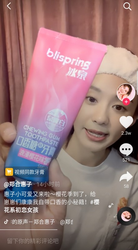 据了解,郑合惠子种草冰泉口香糖牙膏的视频能快速走红有两大重要原因。一是因为郑合惠子不俗的“带货”实力,其甜美笑容下的洁白牙齿成功吸引了大家对冰泉口香糖牙膏的关注;二是因为冰泉口香糖牙膏出色的美白、香氛实力以及高颜值,成功俘获了追求高品质生活的年轻人的“芳心”。