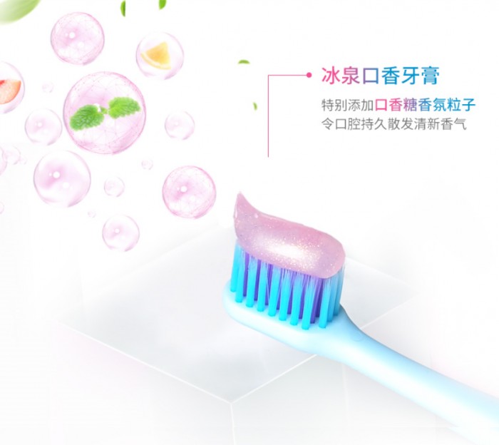 除此之外,冰泉口香糖牙膏还深谙消费者对洁白牙齿的追求心理,特别推出了泉爽白系列产品。该系列牙膏中添加了植酸钠、HCS因子,帮助去除牙渍、高效清洁,还原牙齿洁白本色;同时,该系列牙膏中还特含法国阿尔卑斯山冰川水,借助冰川水的天然高活性维持口腔机能、强化组织黏膜,并平衡口腔pH值、减少细菌滋生。而且,这种冰川水还有天然深养护作用,可以助力营养牙龈、健康牙周、坚固牙齿。值得一提的是,冰泉口香糖牙膏尊重年轻人在口香方面多元化的追求,在泉爽白系列产品中细分推出清香蜜桃味、浪漫樱花味、香橙薄荷味等6大香氛口味,让消费者可以根据个人喜好,获得专属口腔香氛享受。