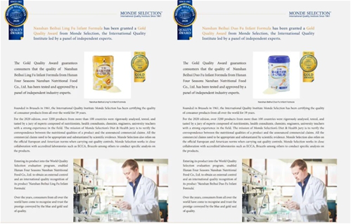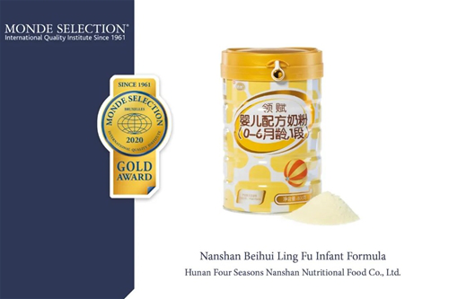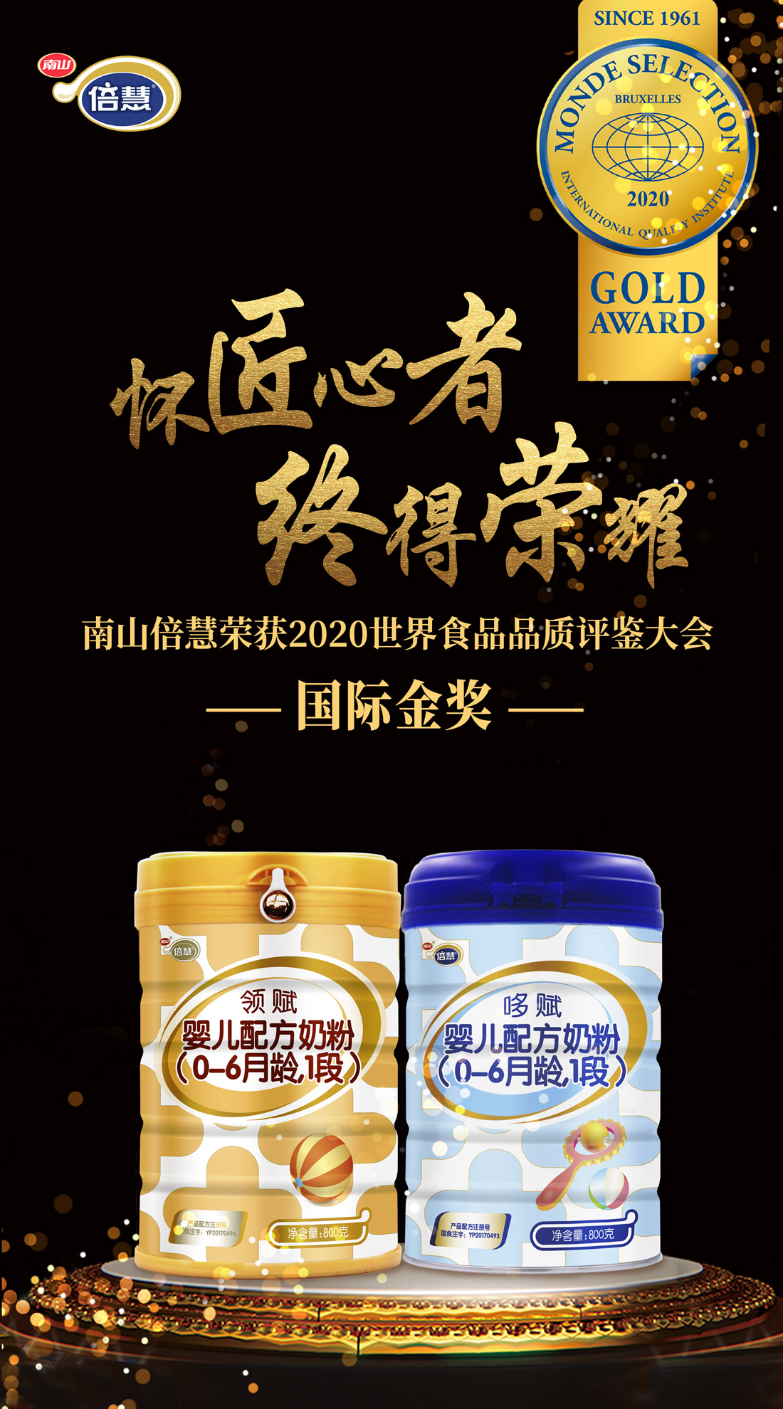 4月3日,2020年「世界食品品质评鉴大会」奖项揭晓,南山奶粉旗下倍慧婴幼儿配方奶粉再度摘得Monde Selection(世界食品品质评鉴大会)金奖。继2019年之后,南山成为蝉联该奖项的中国婴幼儿奶粉品牌。四季南山总经理卜球表示,这不仅是对南山的肯定,更是对中国奶粉的认可。