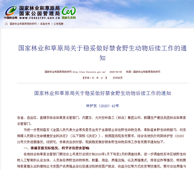 对于养殖户们关注的补偿问题,国家林草局表示,针对禁食措施给部分养殖户、从业人员造成损失或影响等情况,各级林业和草原主管部门要在摸清底数、科学评估基础上,及时向地方政府报告,提出合理补偿建议,明确补偿范围。