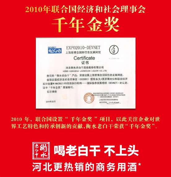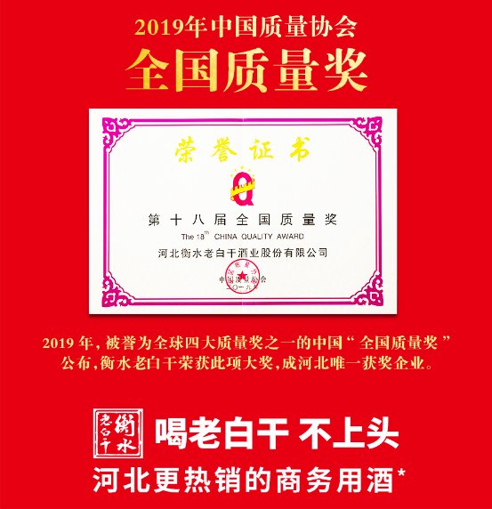 百年前,衡水老白干代表中国白酒首次登上世界舞台,荣获巴拿马博览会最高奖项——甲等金奖;2010 年,经联合国有关机构批准,国际信息发展组织授予衡水老白干“千年金奖 ”称号;2018年,世界烈酒大赛,衡水老白干1915征服世界味蕾,揽获“双金奖”和“全场最佳”;2019年衡水老白干荣获国家级世界性奖项——全国质量奖,成为十八届全国质量奖河北省唯一获奖企业。