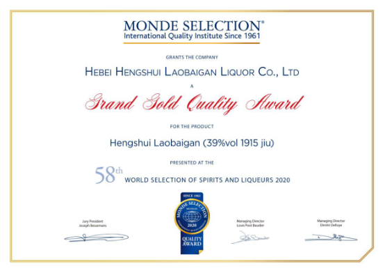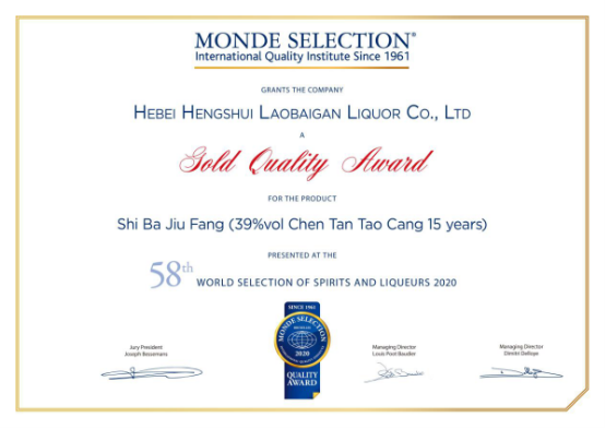 业内人士公认,如果获得MondeSelection世界品质嘉奖,就相当于达到国际食品评价基准的要求,意味着该食品已经获得了世界各国包括食品发达国家的认可与推崇。衡水老白干的两款产品,十八酒坊15年39%陈坛陶藏荣获金奖,39%衡水老白干1915酒荣获该评选的最高奖项——特级金奖,无疑是对衡水老白干产品品质的最好证明,也代表中国白酒受到了世界上食品领域专家及酒爱好者的关注。