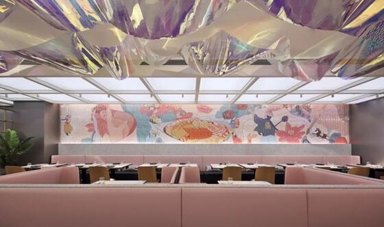 以黄记煌广州云门NEW PARK店为例,门头以大面积钢化玻璃为主,通透明亮;进门之后,左边墙壁是古代屋檐纹样的简化,右边墙壁则是黄记煌定制的御厨主题插画,充满历史底蕴,也给人一种时尚清新之感。
