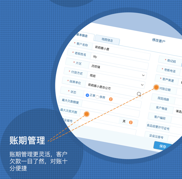 由于不同商超门店结账日期都不同,当对接门店数量过多时,经销商很容易搞混或忘记结账日期,而错过结账日期可能就会面临当期无法顺利结账的问题,为了帮助经销商更高效地管理账目,此次舟谱云管家功能更新增加了账期管理功能。而借助账期管理这一功能,经销商不仅可以提前在系统内给每一位客户设置好对账日期,按账期日进行筛选即可清晰查询到当日应还款商超的名称,还可以在对账明细表里清楚查看每位客户的欠款明细。另外,对账界面中还添加了本月欠款、上月欠款、累计欠款等,方便财务进行更严格的账期管理。
