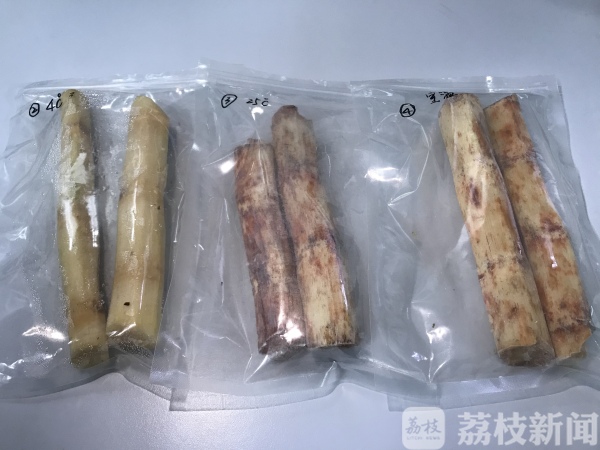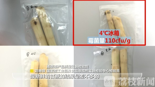 为了一探究竟,记者从水果店买来一些新鲜的甘蔗,并把它们送到了南京质检院的实验室,实验室的人员对实验进行了设计。南京质检院国家加工食品及食品添加剂监督检验中心检验员刘艳容介绍:首先将新鲜的甘蔗分成四组,第一组当天就检测,检测新鲜的甘蔗看有没有霉菌的污染;第二组是将甘蔗放到4℃冰箱,模拟消费者一般储藏食物冷藏的条件下,放三天之后看有没有霉菌生长;还有一种是放到25℃培养箱;第四组是直接放到室内的桌面,随机的一个室温条件,看甘蔗的变化情况。