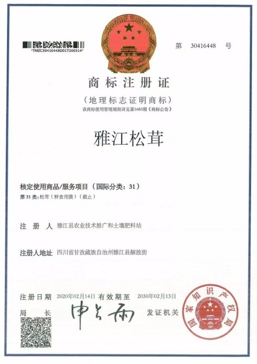 为进一步打响“中国松茸之乡”品牌,近年来,雅江县积极推进地理标志、产品商标的申报注册工作,经过两年多的努力,“雅江松茸”(鲜品)地理标志证明商标终于申报成功。据了解,该县今年3月还启动了“雅江松茸”国家驰名商标认证工作,积极助推全县产业发展,为实施乡村振兴战略续写新篇章。
