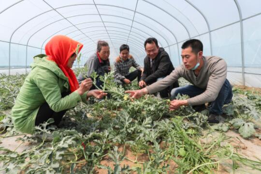 4月24日,在连云港市赣榆区塔山镇倪林子村,农技人员为贫困户提供大棚西瓜专项技术培训。