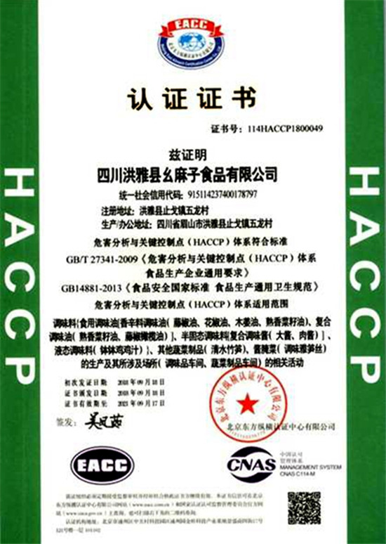 “幺麻子”品牌,取得自主知识产权(专利)5项、先后获得四川省重点龙头产业化企业、四川省著名商标、四川省名牌产品、四川省重合同守信用单位、四川省川调行业创新发展领军企业,通过了ISO9001和ISO22000食品安全管理体系双认证。