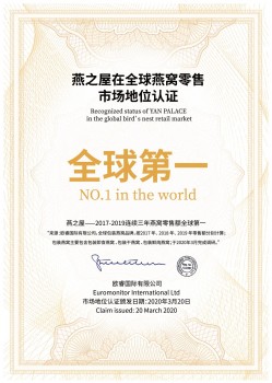 22年的发展,无论是品德还是实力,燕之屋都成为了被国内外所认可的“燕窝专家与领导品牌”。2020年3月,燕之屋获得世界权威市场调查机构“欧睿国际”颁布的“2017-2019连续3年燕窝零售额全球第一”和“2017-2019连续3年燕窝零售额全球领先”的双项权威认证,登上全球包装燕窝品牌零售第一的冠军宝座。2020年4月,中国品牌力指数(C-BPI)研究成果发布,燕之屋荣膺食品行业燕窝品类第一品牌。多项权威认证,再次证明了在黄健带领下的燕之屋,稳固根本,高速创新,有着无可撼动的权威地位。