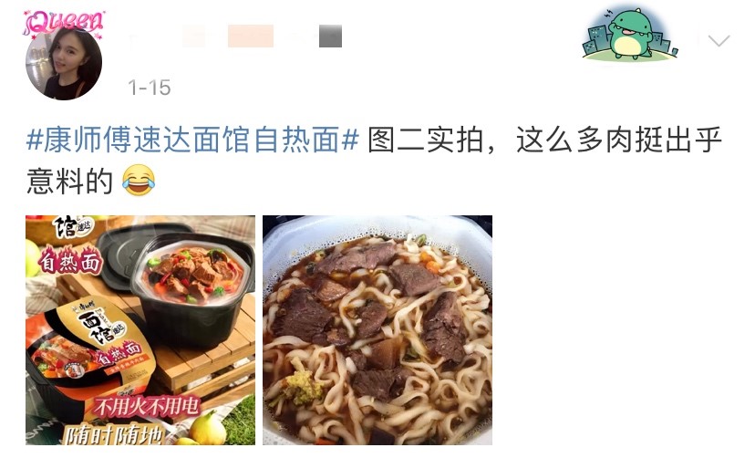 “走到哪儿都能吃上饭店口感的牛肉面”、“这么多肉出乎意料”......早在今年春节期间,大批自驾返乡的消费者,就曾为康师傅速达面馆自热面集体打call,他们甚至提前囤满了后备箱,在高速堵车时、在中途休息时,只需随手拿出一瓶矿泉水,15分钟就是一顿饕餮大餐。于自己,是味蕾与心情的双重满足;于旁人,则是一万分的羡慕之情溢于言表。