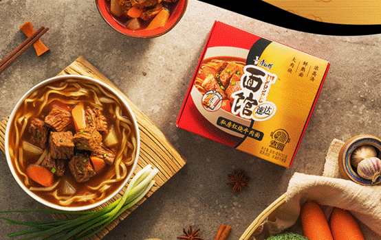随后,速达面馆系列又推出衍生款速达煮面,这次瞄准家庭场景,仍然有私房红烧牛肉面和金牌香辣牛肉面两种口味,秘制红烧配方双重调味,辅以8小时熬制醇厚牛骨高汤,宣称在家就能煮出一碗面馆级醇香好面。