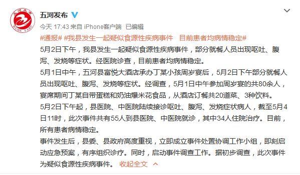 5月2日下午起,五河县医院、中医院陆续接诊呕吐、腹泻、发烧症状病人,截至5月4日11时,此次事件共有55人到县医院、中医院就诊,其中34人住院治疗。目前,所有患者病情稳定。