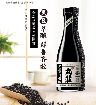 首先在原料上,黑豆与黄豆,虽同是植物大豆,但滋味与营养却有所差别。黄豆蛋白质含量在35%左右,是鸡蛋的2.5倍,且含有大量的亚油酸,对身体十分有益。而黑豆则拥有比黄豆更出色的营养价值,其蛋白质含量是鸡蛋的三倍,人体必需氨基酸超过黄豆25%,并富含花青素、多酚等抗氧化物质,且人体对黑豆营养的吸收十分友好,可高达95%。市面上有个在台湾家喻户晓的品牌“丸庄”,专注黑豆酱油已有110年。它旗下的黑豆原汁酱油,就采用全黑豆酿造,色浅味鲜,自然回甘,是现代健康生活之首选!