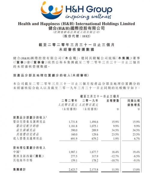 2020年面对新冠肺炎疫情(COVID-19)的挑战,依托中国市场婴幼儿营养及护理用品业务单元(BNC)和成人营养及护理用品业务单元(ANC)“双核”引擎的强劲表现,集团第一季度业绩持续增长。截至2020年3月31日前三个月,健合集团营收较去年同期双位数增长13.0%至人民币24.24亿元,中国区实现增长19.4%。