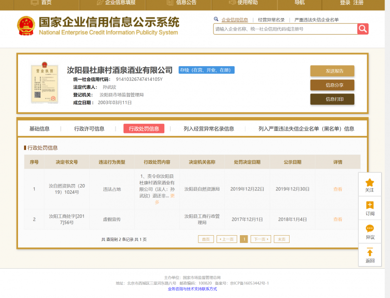 国家企业信用信息公示系统数据显示,汝阳县杜康村酒泉酒业有限公司因违法占地,于2019年12月22日被汝阳县自然资源局责令退还非法占用的3248.46平方米土地;没收在非法占用的2530.37平方米土地上新建的房屋;对非法占用的2530.37平方米旱地处以每平方15元罚款,对非法占用的718.09平方米村庄用地处以每平方3元罚款,罚款共计40109.82元。