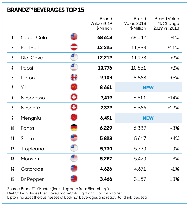 在《2019全球最具价值的百大品牌》报告中,奥地利红牛在饮料类榜单中获得高位,排名第二。饮料类榜单评估了所有不含酒精的即饮产品品牌,包括充气软饮、果汁、瓶装水、功能性饮料(运动与能量)、咖啡与茶(热饮与冷饮)以及乳饮料。而奥地利红牛是其中唯一实现了品牌价值两位数百分比增长的功能性饮料品牌,增长11%,品牌价值达到132.25亿美元,在整体充气饮料与功能性饮料品牌价值增长疲软甚至下跌的情况下,非常亮眼。