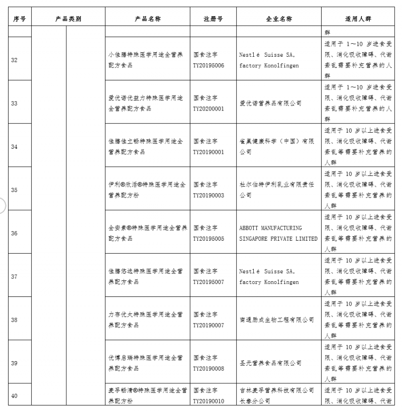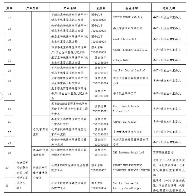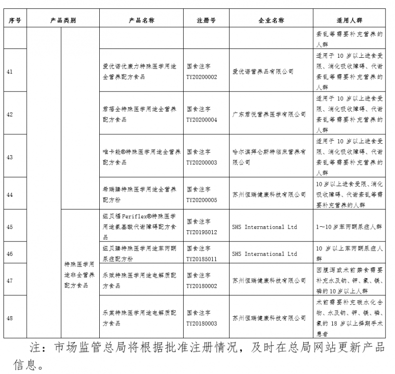 人民网北京5月17日电 据国家市场监管总局网站消息,市监总局昨日发布《特殊医学用途配方食品产品批准注册清单》,截至2020年5月13日,通过特殊医学用途配方食品注册审批的配方食品有48个。其中,适用于0月龄至12月龄儿童的有29个,包括无乳糖配方6个、乳蛋白部分水解配方5个、乳蛋白深度水解或氨基酸配方3个、早产/低出生体重婴儿配方11个、婴儿营养补充剂3个、氨基酸代谢障碍配方1个;适用于1岁以上人群的有19个,包括全营养配方15个、非全营养配方4个。
