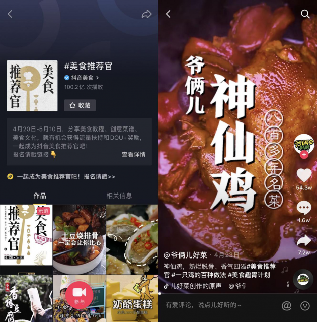 近期,抖音发起了#美食推荐官 活动,邀请多位美食行业大咖参与,并通过创意方式向全国的美食爱好者征集视频,传播中华美食文化。截至目前,有10万网友参与#美食推荐官 活动征集,话题相关视频播放量超过100亿次。