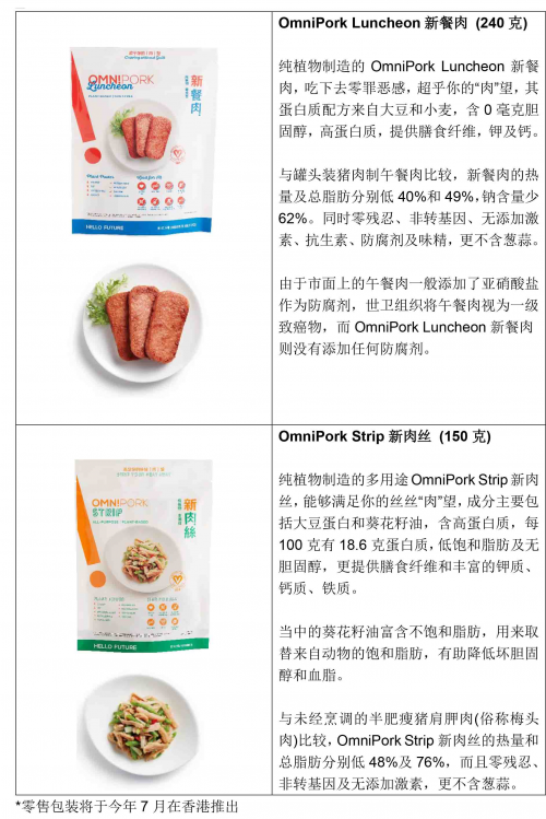 OmniPork Luncheon新餐肉和OmniPork Strip新肉丝的零售包装将于今年7月在香港推出。