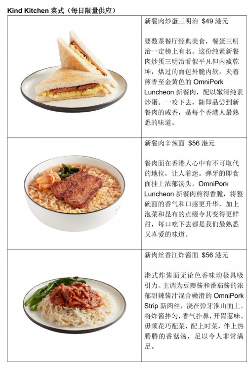 另外,明天(5月19日)起Green Monday集团旗下位于香港的Kind Kitchen将率先独家供应相关菜式,包括新餐肉炒蛋三明治、新餐肉辛辣面及新肉丝香江炸酱面。
