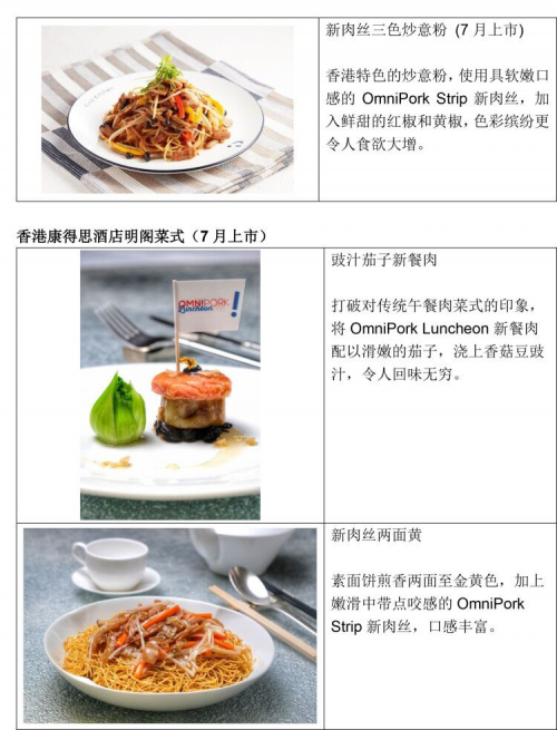 朗廷酒店集团一向致力支持环保,推动绿色可持续饮食,旗下两间位于香港的餐厅将于七月推出采用OmniPork Luncheon新餐肉及OmniPork Strip新肉丝制作的菜式。包括香港康得思酒店的米其林一星中菜厅明阁,其行政总厨李悦发师傅设计的三道精美菜式,包括:豉汁茄子新餐肉、新肉丝三丝炆米粉及新肉丝两面黄;由明阁(湾仔)行政总厨陈汉章师傅主理的筷趣滋味午餐便当专卖店,也会推出辣茄新餐肉温泉蛋饭。