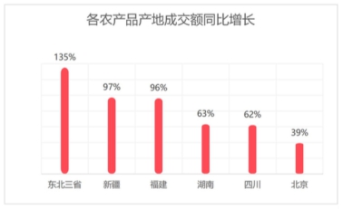 值得一提的是,在农产品消费中,“明星效应”特别明显。所谓一招“鲜”吃遍天,一个产区只要有一款“知名”农产品,在信息经济的放大效应作用下,能极大地拉动当地农产品热销。比如“东北大米”全国闻名,其优质粮食产地的标签带动了大豆、玉米、木耳等农产品的热销;新疆特产“枣夹核桃”、“葡萄干”等产品具有鲜明的产地标签,成交额同比增长超过 96%。此外,湖南、四川产地的食品成交额同比增长超过62%。
