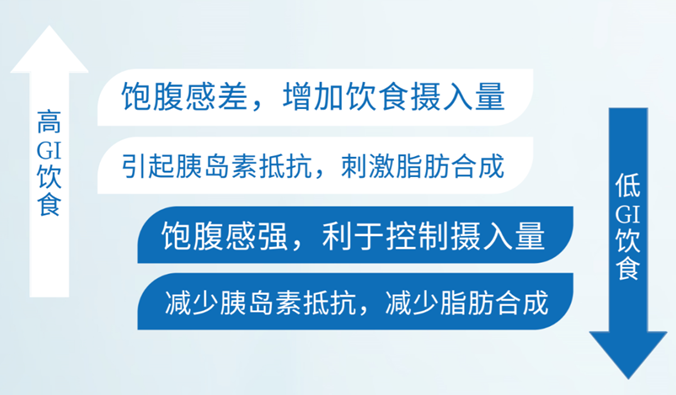 一方面,低GI食物其中的碳水化合物被机体吸收速度慢,故饱腹感持久,自然而然就会减少进食。