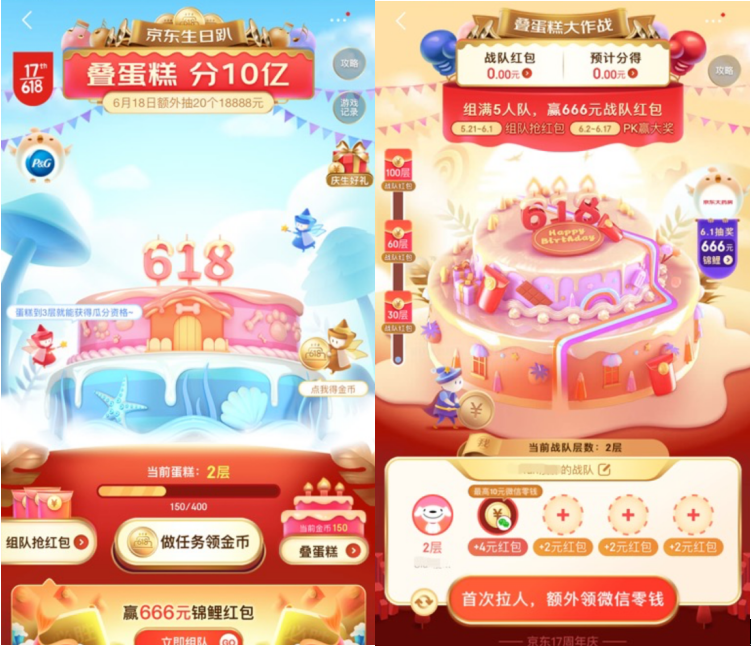 和京东一起庆生怎能少了仪式感?这不,京东要做一个全民都能“吃”到的大蛋糕,将满满的福利通过全新互动的新玩法进行瓜分。京东618携手百大品牌举办了一个盛大的“生日Party”——“全民叠蛋糕”瓜分10亿红包!约上你的家人朋友组队PK,领取金币叠蛋糕,叠的越多福利越多,还等什么,是时候展现你真正的技术啦!