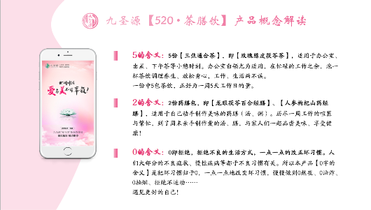 九圣源【520茶膳饮】是一款倡导人们“爱与美”健康生活方式、具有网红基因的健康产品。一直以来,九圣源坚持采用高品质的道地食材,并崇尚创新发展传统经典膳方,从而赋予中医特色健康产品新的生命力!