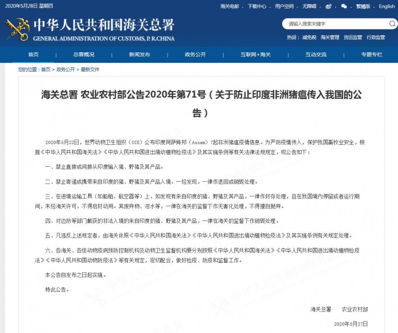 公告称,2020年5月22日,世界动物卫生组织(OIE)公布印度阿萨姆邦(Assam)7起非洲猪瘟疫情信息。为严防疫情传入,保护我国畜牧业安全,根据《中华人民共和国海关法》《中华人民共和国进出境动植物检疫法》及其实施条例等有关法律法规规定,现公告如下: