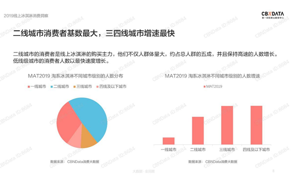 根据第一财经商业数据中心发布的《2019线上冰淇淋消费洞察》显示,2017-2019年线上冰淇淋消费规模呈翻倍增长趋势。其中三四线城市消费人群近年保持了强有力的增长。分析认为,冰淇淋如此高爆发的订单增速,与其典型的低价高频商品特性及以家庭为单位的消费场景关系不可小觑。