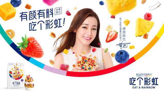 五谷磨房作为天然营养健康食品公司,在“谷物食品”中一直担当着开创者和行业领导者的角色,2020年五谷磨房推出高端麦片品牌“吃个彩虹”。丁香医生作为泛健康领域的健康服务品牌,秉承“健康更多,生活更好”的愿景,为用户提供多元化的大众健康服务,聚焦医院外健康场景,致力于做健康生活方式的向导。这次,五谷磨房不仅与丁香医生专家团共同研发了0添加糖款,还盛情邀请迪丽热巴成为“吃个彩虹”水果麦片代言人,“吃个彩虹”自然与众不同!