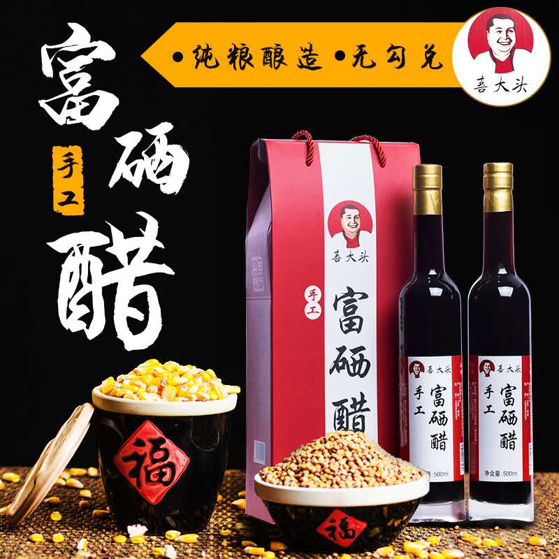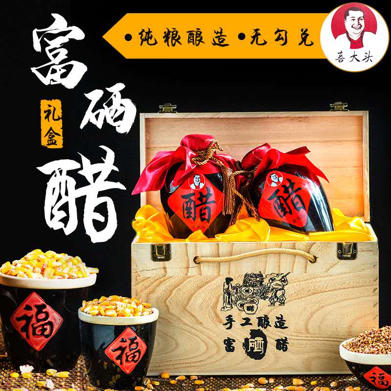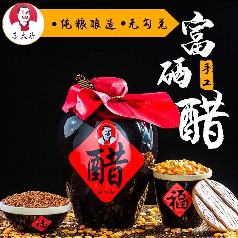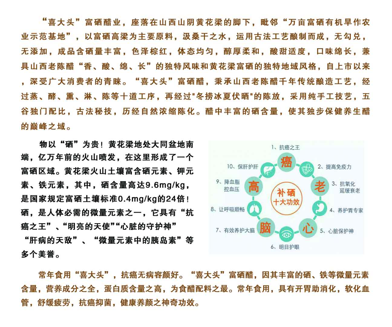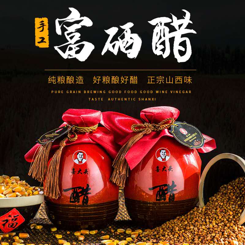 “喜大头”富硒醋,秉承山西老陈醋千年传统酿造工艺,经过蒸、酵、熏、淋、陈等十道工序,再经过冬捞冰夏伏晒"的陈放,采用纯手工技艺,五谷独门配比,古法秘技,历经自然浓缩陈化。醋中丰富的硒含量,使其独步保健养生醋的巅峰之域。