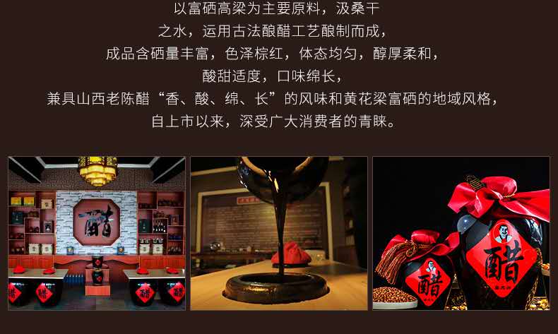 “喜大头”富硒醋业,正是坐落在山西山阴黄花梁的脚下,产自“小杂粮王国”山西,毗邻“万亩富硒有机旱作农业示范基地”,以富硒高粱为主要原料,汲桑干之水,运用古法工艺酿制而成,无勾兑,无添加,成品含硒量丰富,色泽棕红,体态均匀,醇厚柔和,酸甜适度,口味绵长,兼具山西老陈醋“香、酸、绵、长”的独特风味和黄花梁富硒的独特地域风格,自上市以来深受广大消费者的青睐。