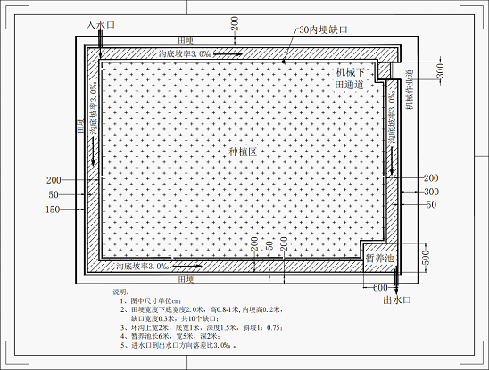 ②鱼凼(暂养池):每块田可设置鱼凼1~2处,设置在排水口附近,与环沟/边沟相通。鱼凼面积占整块田面积的3~5%,池深200~250cm,形状以长方形为宜。