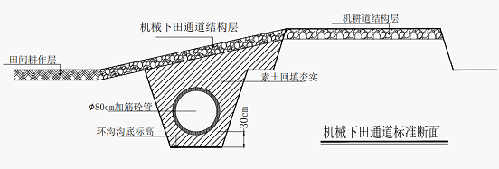 (3)农机通道。农机通道的设置应保证农用机械通行和鱼沟水体循环流动。农机通道推荐用1~2根Ф≥60cm、长250cm水泥涵管并列埋于鱼沟中并用田土填平,每块田设置农机通道1~2处。详见图3。