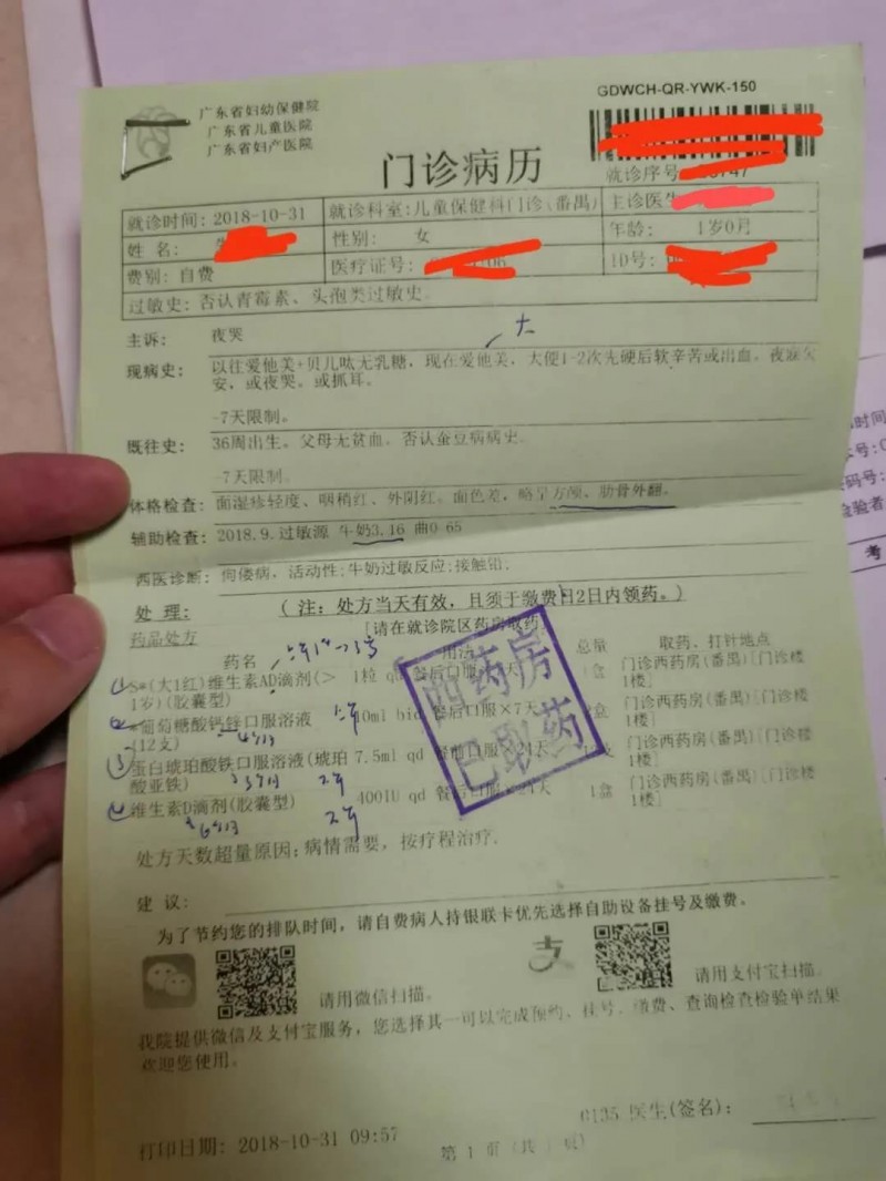 一位家长展示在广东省妇幼保健院确诊孩子患有牛奶过敏的病例及拿到的《婴儿湿疹、牛奶蛋白过敏注意事项》。