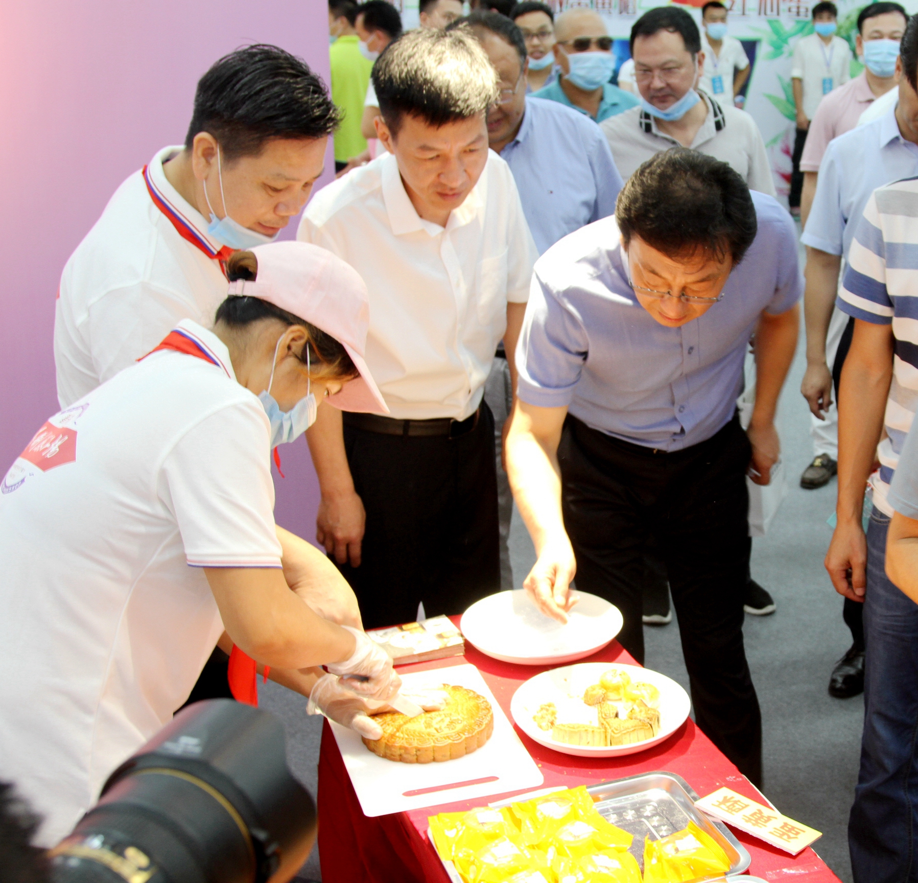 张辉、杨斌、孙环志等品尝黄家月伍仁叉烧大月饼。陈仕优/摄