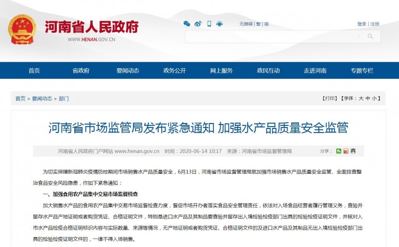 6月13日,河南省市场监管局就加强市场销售水产品质量安全监管、全面排查整治食品安全风险隐患发布紧急通知。
