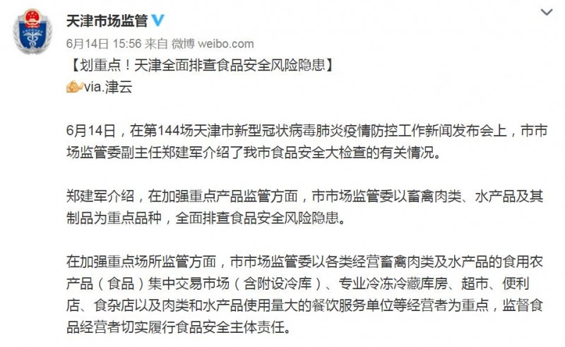 6月14日,在第144场天津市新型冠状病毒肺炎疫情防控工作新闻发布会上,天津市市场监管委副主任郑建军郑建军介绍,在加强重点产品监管方面,天津市市场监管委以畜禽肉类、水产品及其制品为重点品种,全面排查食品安全风险隐患。