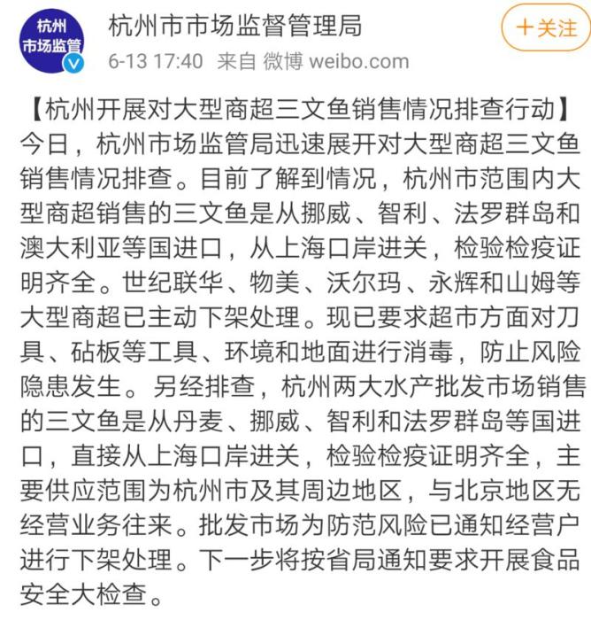 据悉,杭州市范围内大型商超销售的三文鱼是从挪威、智利、法罗群岛和澳大利亚等国进口,从上海口岸进关,检验检疫证明齐全。杭州市市场监管部门现已要求超市方面对刀具、砧板等工具、环境和地面进行消毒,防止风险隐患发生。目前,世纪联华、物美、沃尔玛、永辉和山姆等大型商超已主动下架处理。