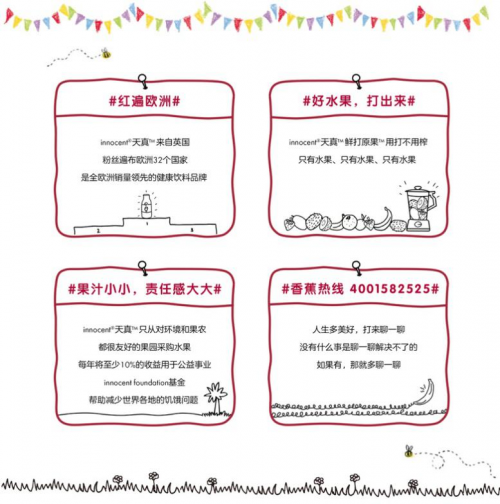 在innocent天真,好事每天都在发生。我们希望小果伴们身体健康充满活力,每天为大家制作健康天然的果汁;我们关心地球,尽自己的能力保护环境和果农;我们是一个有大大责任感的小小果汁品牌,每年将全球利润的10%用于公益事业。innocent的天真是天生的,认真的。
