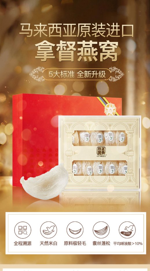 全面升级后的拿督燕窝,真的是让人不得不PICK,首先拿督燕窝选用的原材料就是非常稀有的拿督盏——极轻毛燕盏,具备更大盏型和更少杂质的特质。为何说是稀有材料,是因为这种燕盏不仅对金丝燕的生存环境和食物环境要求严格,对金丝燕本身的要求也是极高的,因此其产量不到10%。其次拿督燕窝沿袭了正典一贯的手工干挑工艺,不会破坏燕窝的囊丝结构,使燕窝保持天然原盏状态,同时减少了营养流失,使唾液酸含量更高,这款燕窝的平均唾液酸可达10%以上,口感微甜,清爽不腻。最后拿督燕窝采用无“水”运输,可有效拒绝亚硝酸盐和霉菌的滋生,而且每一盏燕窝都有CAIQ溯源,食用更安心。