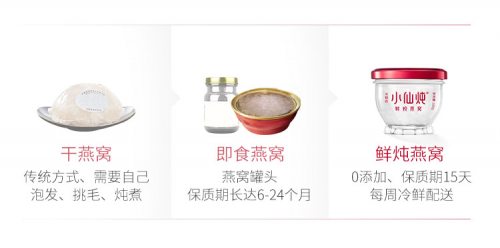 据天猫生意参谋、京东商智数据显示,小仙炖2020年2~5月连续4个月占据滋补类目第一名,5月同比增长308%。继小仙炖创新鲜炖燕窝品类之后,嗅到市场的红利,同仁堂、燕之屋等传统滋补大牌纷纷入局鲜炖。近两年来,鲜炖燕窝的销量增速已远高于干燕窝和传统的即食燕窝,市场潜力毋庸置疑。