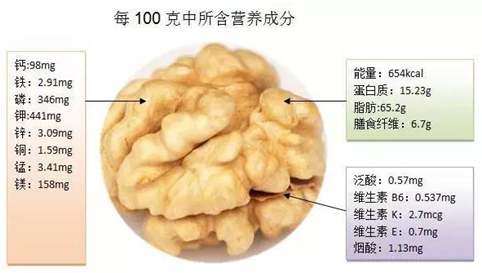 中国农业大学原食品营养与安全系主任何计国表示,多吃核桃类的坚果食品,对于神经有很好的补益作用。特别是核桃中的高卵磷脂含量,可以为机体提供胆碱,形成神经递质乙酰胆碱,从而维持神经系统的功能。另外,坚果中还富含B族维生素,特别是核桃、瓜子、花生中维生素B1、B2含量非常高,经过一系列变化,将提高人体新陈代谢,还有利于身体发育。