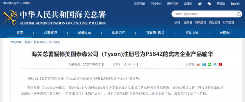 21日通报:自6月21日起暂停美国泰森(Tyson)公司注册号为P5842的禽肉屠宰企业产品输华。