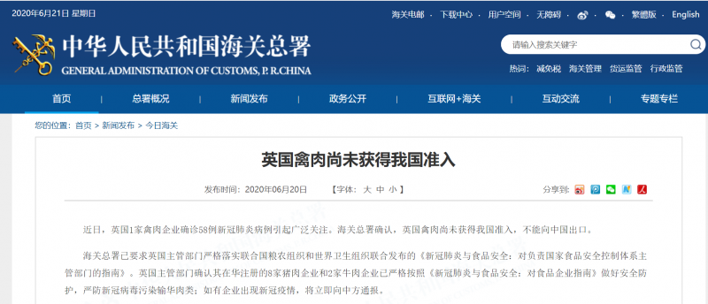 20日通报:近日,英国1家禽肉企业确诊58例新冠肺炎病例引起广泛关注。海关总署确认,英国禽肉尚未获得我国准入,不能向中国出口。
