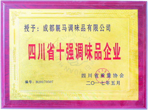 2017年由四川省质量协会颁发的“四川省十强调味品企业”并通过食品安全管理体系认证,四川名优产品证书等相关资质。