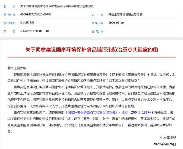 第一财经记者今天(7月1日)从生态环境部了解到,该部已同意以北京工商大学为依托单位,建设国家环境保护食品链污染防治重点实验室。
